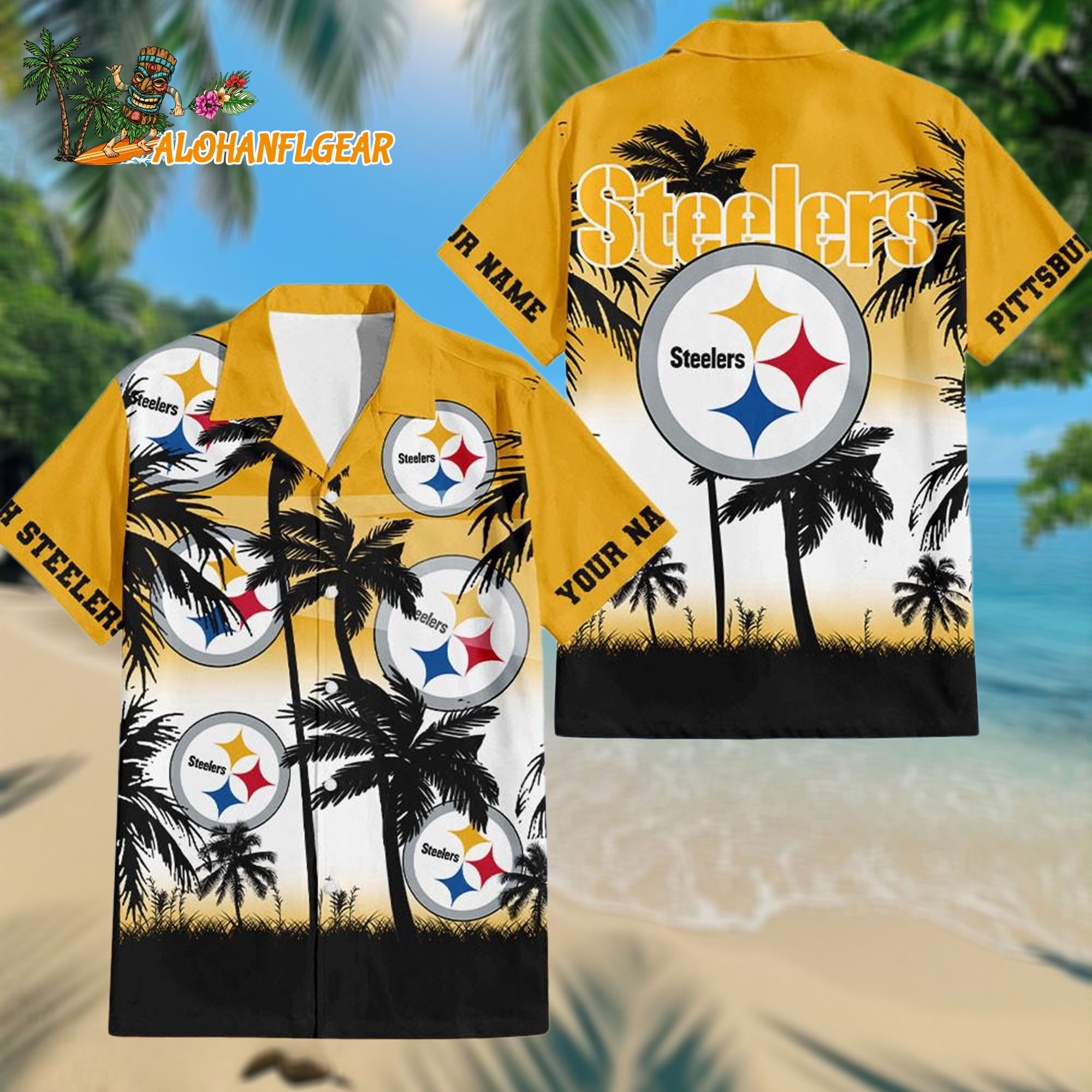 👉 Shop your Personalized Pittsburgh Steelers Palm Tree Summer Design Aloha Hawaiianan Shirt now at AlohaNFLgear.com and show your team colors the tropical way.